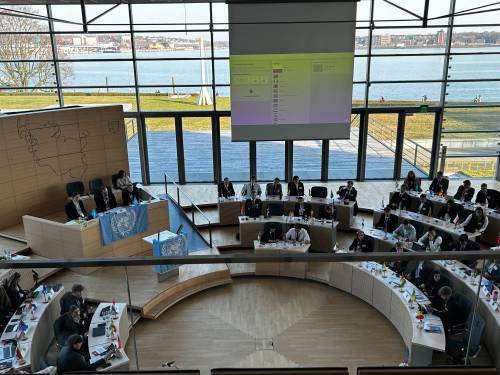 Bereits die feierliche Eröffnung der diesjährigen Konferenz im Audimax der Christian-Albrechts-Universität zu Kiel war ein eindrucksvoller Auftakt. Hier versammelten sich die Teilnehmenden, um sich auf die bevorstehenden Debatten einzustimmen und die Bedeutung internationaler Zusammenarbeit zu reflektieren. Begleitet wurde diese Eröffnungsveranstaltung durch Reden der Generalsekretärin der MUNSH Mona Bickel-Dabadghao, der Landtagsvizepräsidentin Eka von Kalben und Dr. Hauke Petersen, der Stellvertreter des Landesbeauftragten für Politische Bildung. Anschließend begannen die intensiven Verhandlungen im Schleswig-Holsteinischen Landtag, der seit vielen Jahren Gastgeber der Model United Nations Schleswig-Holstein ist. Die Sitzungen fanden in den Räumlichkeiten des Parlaments statt, was der Konferenz eine besonders authentische Atmosphäre verlieh.