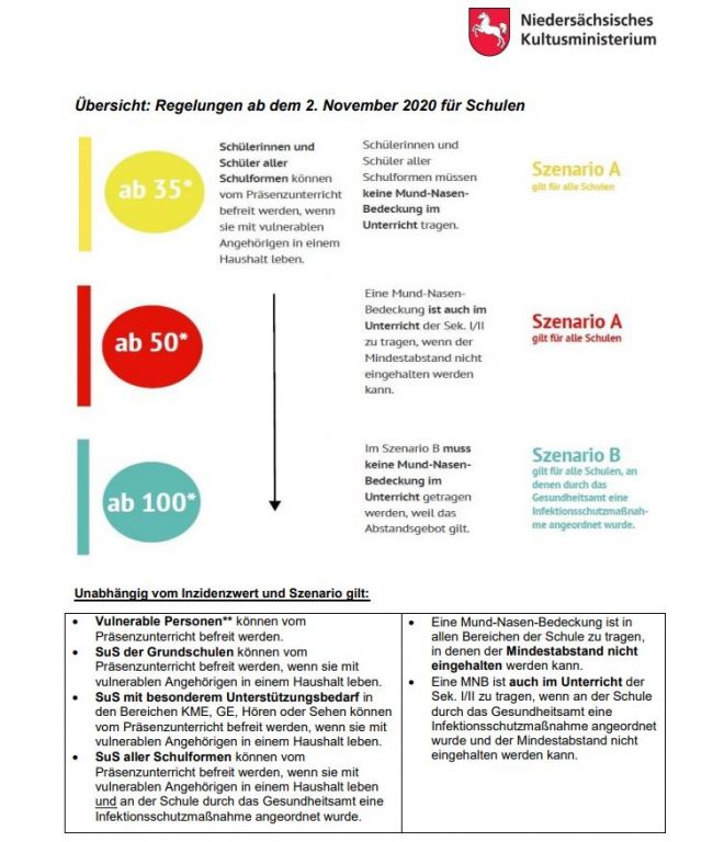 Eine Übersicht des Nds. Kultusministeriums über die Regelungen ab dem 2. November 2020 für Schulen finden Sie hier: