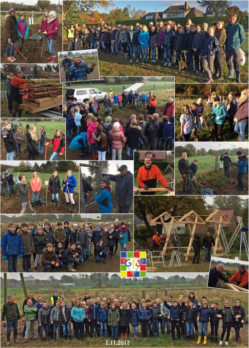 Unser Schulwald ist um 2.750 Bäume und Sträucher reicher. Im Rahmen der landesweiten „Naturschutzwoche für Kinder“ fand bei uns vom 6. bis zum 8.11.2017 die zweite Pflanzrunde auf dem Schulwaldgelände statt. Anders als bei der ersten Pflanzrunde im Frühjahr 2016, als nahezu die gesamte Schulgemeinschaft die Spaten in die Hand nahm, durften sich diesmal nur die Jahrgänge 5-7 sowie der Jahrgang 6 der Realschule auf den Weg in Richtung Falkenhardt machen. Gewissermaßen als Vorhut war bereits am Mittwoch (1.11.) die Klasse 6d mit Sylke Teuteberg zum Schulwaldgelände gekommen, um mit Förster Horst Wieting von den Landesforsten Ahlhorn, Försterin Juliane Kohlmeyer sowie Sabine Buse und Maria Schmutte als den Hauptverantwortlichen bei der Organisation der 2. Pflanzrunde die Schilder mit den Baum- und Straucharten dort aufzustellen, wo später die jeweilige Art gepflanzt werden sollte. Am Freitag (3.11.) wurden die 2.750 Setzlinge dann angeliefert und „eingeschlagen“, d.h. die Wurzeln wurden in dafür aufgeworfenen Furchen gelegt und mit Erde bedeckt. Zwar hatte es am Wochenende noch manch sorgenvollen Blick auf die Wettervorhersage gegeben, doch unser Glück ließ uns auch diesmal nicht im Stich und am Montag (6.11.) begleitete uns beim Pflanzen sogar strahlender Sonnenschein. Wie vor anderthalb Jahren nahmen wir wieder den Fußweg an der Hunte entlang, jeweils zwei bzw. drei Klassen pro Doppelstunde. An der B69 waren wir Wanderer sicherlich die einzigen Verkehrsteilnehmer, die der baustellenbedingten Sperrung der Bundesstraße etwas ausgesprochen Positives abgewinnen konnten: Wir konnten sie gefahrlos überqueren. Vor Ort warteten - perfekt vorbereitet wie schon 2016 - die Förster Gert Habermann und Juliane Kohlmeyer. Unterstützt wurden sie diesmal von Ilse Grotian, die die Sechst- und Siebtklässler bereits von der Ausstellung „Faszination Ameisen“ (Juni 2017) kannten. Horst Wieting, der selbst nicht dabeisein konnte, hatte zudem seine FÖJlerin Maria Bohmann für uns freigestellt und auch unsere FÖJlerin Laura Scheper war zur Stelle. Wilhelm Paradiek und Heiner Tiedemann hatten einen Pavillon aufgestellt, Sabine Buse noch vor ihrer ersten Unterrichtsstunde Getränke, Obst und Müsliriegel gebracht. So stand alles parat, als die ersten Klassen kamen. Bevor es ans leibliche Wohl ging, zeigten Gert Habermann und Juliane Kohlmeyer den Schülern zunächst, wie man mit einem Hohlspaten Bäume pflanzt. Die Siebtklässler waren dabei schon „alte Hasen“, da sie als einzige schon bei der ersten Pflanzrunde 2016 dabei waren. Als diejenigen, die das Gelände noch als matschigen Maisacker gesehen hatten, konnten sie auch erkennen, was Mutter Natur in anderthalb Jahren zustande gebracht hat. Die Erlen beispielsweise überragen bereits selbst die größten Schüler. Leichte Befürchtungen, dass das Pflanzen angesichts der Grasnarbe bei dieser Runde schwerer sein würde als beim ersten Mal, erwiesen sich als unbegründet. Im Gegenteil, ohne die Grasnarbe wäre es angesichts der Regenmengen, die im Vorfeld niedergegangen waren, ein reichlich matschiges Unterfangen geworden. Auch hier hatten wir also wieder Glück und Feldahorn, Roterlen, Traubenkirschen, Flatterulmen und Hasel, Kornelkirsche, Hundsrose, Schneeball, Schlehen, Weißdorn und Heckenrosen konnten ohne große Schwierigkeiten in die Erde gebracht werden. Am Dienstag (7.11.) kam Franz Hüsing, Direktor der Stiftung „Zukunft Wald“ und Initiator des niedersachsenweiten Projekts „Schulwälder gegen den Klimawandel“, zu uns. Zum einen freute er sich über die fröhlichen Schüler, die emsig arbeiteten und sich anschließend gutgelaunt über die Leckereien hermachten, zum anderen hatte er ein ganz besonderes Geschenk mitgebracht: ein grünes Klassenzimmer. Besonders in Jens Meyer, Wilhelm Paradiek und Heiner Tiedemann hatte er so kompetente Helfer beim Aufbau, dass wir vielleicht sogar eine Rekordzeit erreicht haben - und das trotz „sibirischer Kälte“ an diesem Tag. Jedenfalls stand das Holzgerüst samt Dach um ca. 14.30 Uhr fertig zwischen Storchennest, Thymianbeet und Eingangstor. Am letzten Pflanztag konnte der zuvor für die Essensausgabe benutzte Pavillon wieder abgebaut und unser grünes Klassenzimmer hiermit eingeweiht werden. Am Mittwoch (8.11.) war auch die Elternvertreterin Manuela Mark mit von der Partie, die zuvor die Verbrauchermärkte Edeka und Combi kontaktiert hatte. Von beiden war dankenswerterweise eine Zusage gekommen, uns mit frischem Obst (Edeka) und Getränken (Combi) zu unterstützen. Keine der helfenden Hände vor Ort ließ sich von der Kälte, die auch an diesem Tag nicht weichen wollte, davon abhalten, Äpfel zu schnippeln, Möhren zu schälen, Bananen zu teilen, Wasser bzw. Apfelschorle einzuschenken oder darauf zu achten, dass jeder nur einen Müsliriegel bekam und die Verpackung im entsprechenden Sack landete (was aber in der Regel auch ohne Erinnerung klappte). Hier geht als einem weiteren Unterstützer in Sachen Verpflegungskosten ein herzlicher Dank an die Bingo-Umweltstiftung. Diese hat auf dem Schulwaldgelände vorher bereits das Storchennest und das Insektenhotel finanziert. Apropos Kosten: Bisher noch nicht genannt wurde die Flächenagentur „Wir Vier“, die neben der eigentlichen Fläche und der Schaffung des neuen Huntearms das Kiesbett für Austernfischer, die 60 Obstbäume und nun auch die 2.750 neuen Bäume und Sträucher finanziert hat. Ein besonderer Dank gebührt Gert Habermann und Ilse Grotian, die den weiten Weg von Einbeck bzw. Northeim am Harz auf sich genommen haben, um - ehrenamtlich - den Diepholzer Schulwald zu unterstützen. Ein großes Danke geht selbstverständlich ebenso an Franz Hüsing sowie an Horst Wieting und Juliane Kohlmeyer. Gedankt sei auch allen Kollegen und Schülern, die zu dem reibungslosen Ablauf beigetragen und das Projekt mit ihrer Freude, mit guter Laune und mit ihrer Hände Arbeit wieder einen großen Schritt vorangebracht haben. Weitere 