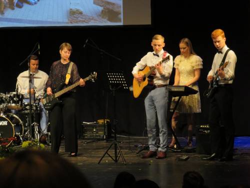 Für die musikalische Untermalung sorgten neben der Abi-Band (siehe Foto) Ayham Fayad (Gesang), Alica Christen (Klavier), Tobias Husmann (Klavier) und Eileen Volpert (Violine).