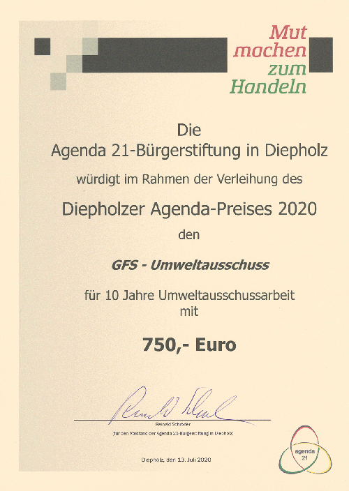 Mehr Informationen, u.a. einen knapp achtminütigen Film, gibt es hier. Wir freuen uns über den Agenda-Preis, den wir am 13.7.20 erhalten haben. Das Preisgeld wird für Umweltprojekte eingesetzt werden. Der von der Agenda-21-Bürgerstiftung ausgeschriebene Wettbewerb stand unter dem Motto "Mut machen zum Handeln". Die Preisverleihung kann hier angesehen werden.