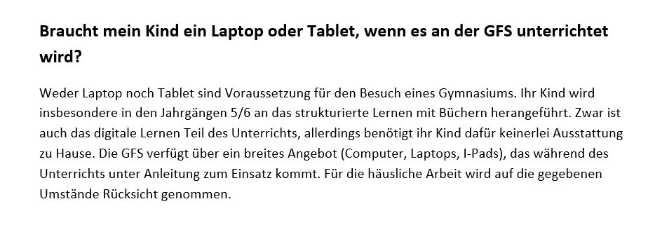 Braucht mein Kind ein Laptop oder Tablet, wenn es an der GFS unterrichtet wird?