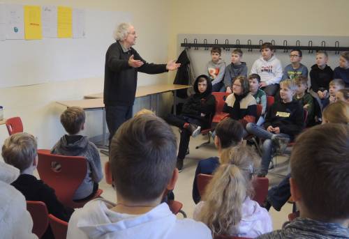 Wenige Tage darauf unterhielt Eberhard Vogelwaid unseren siebten Jahrgang mit einer Reihe ausgesuchter Balladen, von denen einige durchaus (schön)-schaurige Inhalte an den Tag legten (so z.B. Theodor Fontanes „Silvesternacht“), andere aber auch kluge Einsichten vermittelten (z.B. Gottfried August Bürgers „Die Schatzgräber“). Daneben durften natürlich auch „Klassiker“ nicht fehlen (Fontanes „John Maynard“), ebenso wenig wie eine vom Vortragenden selbst verfasste Ballade, was mittlerweile zur guten Tradition des sympathischen Künstlers aus Ottersberg gehört.