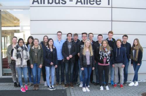 18 Schülerinnen und Schüler der GFS , die Französisch lernen und / oder in Physik ihren Schwerpunkt haben, hatten Gelegenheit, im Rahmen des deutsch-französischen Entdeckungstages in ein deutsch-französisches Unternehmen zu „schnuppern“, wobei sie in diesem Jahr die Möglichkeit bekamen, das Airbuswerk mit Sitz in Toulouse im Standort Bremen zu besichtigen und Genaueres über die Berufsausbildung und das duale Studium bei Airbus zu erfahren. Als zweitgrößter Standort Deutschlands, nach Hamburg, beschäftigt die Airbus Group rund 3200 Mitarbeiter in Bremen, die in der Produktion, im Programmmanagement und im Bereich Finanzen tätig sind. Als Teil des Fertigungsbundes beschäftigt sich der Standort Bremen mit der Flügelausrüstung aller Großraumflugzeuge und mit der Herstellung von Landeklappen aller Airbus-Programme. Schwerpunkt hierbei ist die Entwicklung, Konstruktion und Produktion von jährlich ca. 2,5 Millionen Komponenten. Als die Schülergruppe gegen 10:00 Uhr mit Besucherausweisen ausgestattet war, begann die Führung durch das Werk. Dabei besichtigte sie zunächst ein Projekt, das von Auszubildenden ausgeführt wurde. Es handelte sich dabei um die Restauration eines alten senkrecht startenden Flugzeuges, welches nun auf dem Werksgelände ausgestellt ist. Danach ging es zu den Fertigungshallen für Landeklappen und zu der Halle, in der die „rohen“ Flügel mit den entsprechenden Komponenten ausgestattet werden. Nach dem Besuch in den Airbus Group Hallen bekam die Gruppe ebenfalls eine Führung durch das Tochterunternehmen „Premium Aerotech“ von Airbus Group. Nach kurzer Führung und diversen Erklärungen zu einzelnen Maschinen und Bereichen bekamen die Schüler einen kurzen Blick auf „Airbus Defence & Space“, die eine Sparte der Airbus Group neben „Airbus Operation“ und „Airbus Helicopters“ darstellt. Sie bekamen auch die Räumlichkeit zu Gesicht, in der die Frachten des ankommenden Airbus Beluga entladen werden. Nachdem die Werksbesichtigung endete, gingen sie in das Zentrum der Auszubildenden, wo zwei Studenten des dualen Studiengangs einen interessanten Vortrag über das Unternehmen sowie die Ausbildungs- und dualen Studienmöglichkeiten gaben. Nach Beantwortung entstandener Fragen verließen alle das Gelände mit vielen neuen Informationen und fuhren nach diesem sehr bereichernden Vormittag zurück zur GFS nach Diepholz. Text: Kevin Wiesener, Foto: Annette Wöstmann