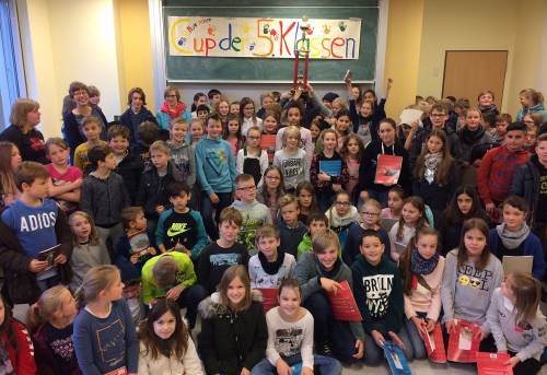 Da sich direkt an den Cup der 5. Klassen die mehrtägige Runde 2 der Schulwaldpflanzung anschloss, mussten die Fünftklässer eine Zeitlang auf die Siegerehrung warten. Am 22.11.17 war es dann soweit und der gesamte Jahrgang versammelte sich in der Mensa, wo der große Wanderpokal bereits wartete. Jubelnd in Empfang nehmen durfte ihn die Klasse 5b, gefolgt von den Klassen 5c, 5a, 5d und 5e. Alle Schüler erhielten ein Präsent, z.B. Blöcke oder Hefte aus Recyclingpapier.