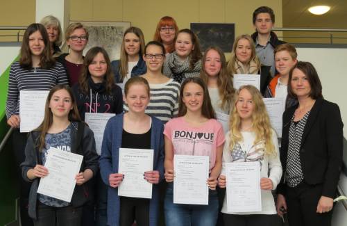 Hausaufgaben in den Ferien? Virtuelle Welt und Umweltproblematik… dies waren nur einige der diesjährigen Themen, die GFS-SchülerInnen ab Jahrgang 8 bei den diesjährigen DELF-Prüfungen auf Französisch zu bearbeiten hatten. Das erfolgreiche Bestehen der DELF-Prüfung (Diplôme en Langue Française) bedeutet eine Zusatzqualifikation, die den SchülerInnen Französischkenntnisse auf vier Niveaustufen im Rahmen des Europäischen Referenzrahmens bescheinigt und ab der B2-Stufe einen Sprachtest an den Universitäten ersetzt. Die Prüfungen werden in Zusammenarbeit mit der Volkshochschule angeboten und vom französischen Erziehungsministerium bescheinigt. Geprüft wurden das Hör- und Leseverstehen, die Schreibfertigkeit und die Fähigkeit, spontan mit einem Französisch sprechenden Prüfer zu kommunizieren. Die Vorbereitungen erfolgten im Französischunterricht durch die Fachlehrerinnen. A1-Niveau: Finja Brauneck, Julia Fricke, Fabienne Fuhlendorf, Jule Gerdelmann, Celina Katzemich, Alina Kraft, Thalia Meyer, Jana Marie Poppenburg und Sina Schmidt. A2-Niveau: Pia Fromme, Xenia Häberle und Lilli Hemann B1-Niveau: Jan Elia Fricke, Wibke Götze und Hakon Rusch B2-Niveau: Adina Sophie Behning, Freya Müller, Lea Overbecke und Klaudia Rape (Text: Annette Wöstmann)