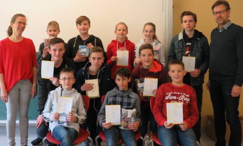 In diesem Jahr gab es insgesamt 13 Preisträger(innen) des Känguru-Wettbewerbs. Sie alle kommen aus den Jahrgängen 5-8. Die oberen Jahrgänge gingen diesmal leider leer aus. Jan Felix Ruppel aus dem Jahrgang 8 hat mit hervorragenden 143,75 Punkten (von 150 Gesamtpunkten) nicht nur einen ersten Preis gewonnen, sondern auch den größten Känguru-Sprung geschafft, d.h. er hat die meisten Aufgaben in Folge ohne Fehler gelöst. Text und Foto: Margit Kreymborg