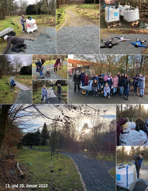 Die Schülerinnen und Schüler der Schulgarten AG erneuerten jüngst die Wege im Schulgarten. Ihr könnt Euch anhand der Fotocollage ein Bild von den Arbeiten machen!