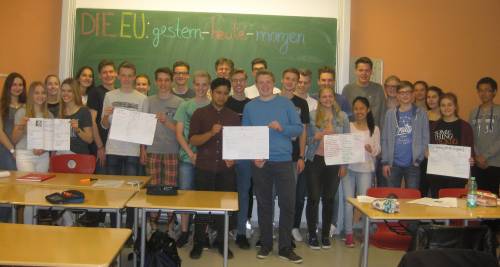 Die Finanz- und Schuldenkrise ist noch nicht überwunden, die Flüchtlingsfrage stellt Europa vor enorme Schwierigkeiten, der Brexit sorgt für Bestürzung, populistische Parteien stellen die politische Idee Europas grundsätzlich in Frage. Kurzum: Europa steht derzeit vor großen Herausforderungen, die den Zusammenhalt auf eine harte Probe stellen. Vor diesem Hintergrund ist es heute umso wichtiger, die Menschen wachzurütteln und von der „Europäischen Gemeinschaft“ wieder zu überzeugen. Schließlich ist sie – und nur sie – ein Garant für Frieden und Wohlstand in Europa. Verschiedenste Parteien, Verbände, aber auch Bürgerinitiativen wie z.B. „Pulse of Europe“ (https://pulseofeurope.eu/de/) leisten wichtige und z.T. auch erfolgreiche Arbeit, um den europäischen Diskurs nicht allein den Populisten zu überlassen. Auch Schule kann ihren Beitrag leisten. Bereits zum elften Mal startete im Mai der EU-Projekttag, an dem Schüler(innen) in ganz Deutschland über Europa diskutieren und angeregt werden sollen, mitzugestalten. In diesem Jahr lehnte sich der Projekttag thematisch an die Unterzeichnung der „Römischen Verträge“ vor 60 Jahren an, da durch die Gründung der „Europäischen Wirtschaftsgemeinschaft“ der wohl wichtigste Meilenstein der Europäischen Gemeinschaft gelegt wurde. Auch die Graf-Friedrich-Schule nahm an diesem Projekttag teil, namentlich alle Schüler(innen) des Jahrgangs 10 unter der Leitung der Fachschaft Geschichte. Das schulinterne Thema sollte lauten: „Europa: gestern – heute – morgen“ In den einzelnen Klassen wurde zunächst in einem Brainstorming geklärt, was die jungen Menschen heute mit dem Begriff „Europa“ verbinden, um in einem zweiten Schritt zu reflektieren, warum und wie diese Bilder von Europa durch diverse Medien oder Diskussionen im Freundeskreis entstehen. Anschließend beschäftigten sich die Schüler(innen) in einer Gruppenarbeit mit der Geschichte der EU. Durch einen Blick in die „Römischen Verträge“ arbeiteten sie die Visionen der Politiker(innen) von 1957 heraus, von wirtschaftlichem und sozialem Fortschritt, vom Wohlstand und vom Frieden in Europa. In einem zweiten Schritt erarbeiteten sie auf der Grundlage eines Zeitungsartikels, welche Ziele von damals 2017 erreicht, welche aber auch nicht erreicht wurden. In einem letzten Schritt sollten die Schüler(innen) selber Visionen entwickeln und einen Blick in die Zukunft werfen: Wie könnte die EU in 40 Jahren aussehen? Welche Probleme werden gelöst sein? Welche nicht? Welche neuen tauchen auf? Am Ende des Projekttages präsentierten die einzelnen Gruppen ihre Ergebnisse. Insbesondere ihr Blick in die Zukunft war oft spannend. So wünscht sich eine Gruppe für 2057 ein europäisches Sportteam bei sportlichen Großveranstaltungen. Eine andere strebt ein einheitliches Schulsystem an – Träumen war ja erlaubt! Die meisten wünschen sich aber eine engere Zusammenarbeit in der Sicherheitspolitik, um die große Gefahr des Terrorismus besser als heute bekämpfen zu können. Zusammenfassend lässt sich sagen, dass die Zehntklässler(innen) gar nicht so verschieden denken wie die Politiker(innen) 1957. Frieden sollte das oberste Ziel sein – und der Weg dahin kann nur über eine enge Zusammenarbeit führen. Es bleibt zu wünschen, dass Schüler(innen) an diesem Tag für das wichtige Thema Europa sensibilisiert und von der europäischen Idee nachhaltig überzeugt wurden. Text: Dr. Jens Gering, Foto: Annette Wöstmann (abgebildet: Schüler(innen) der 10b)