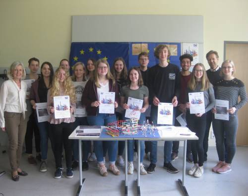 Auch im Schuljahr 2017/18 nahmen wieder Schülerinnen und Schüler der GFS am Europäischen Wettbewerb, dessen Schirmherr der Bundespräsident ist, teil. Dieses Jahr lautete das Thema „ Denk mal – worauf baut Europa?“. Im Rahmen des Seminarfachs „Europa“ des Jahrgangs 12 und in der Europa-AG wurden Wettbewerbsbeiträge zu unterschiedlichen Modulen angefertigt, die frei bearbeitet werden konnten. So entstanden z.B. Bilder, Modelle, Collagen und Texte. Nele Raitzig, Marlene Kirchberg und Lena Siemering entwickelten ein Plakat zum Thema „ Das geschriebene Wort“, das die Entwicklung der Schrift von Höhlenmalereien über den Diskus von Phaistos und Buchdruck nach Gutenberg zur digitalen Schrift zeigt. Alina Enns und Lilli Borchmann zeigten, wie Vielfalt stark macht. Tjorben Meyer und Ahmed Hamdi Yavuzata entwickelten zu diesem Modul eine –fiktive- Radiosendung, ähnlich wie Philip Mucker und Markus Seißenschmidt, während Jule Gerdelmann und Veit Mengedoth ein Modell aus EU-Ländern mithilfe von Zahnstochern und dem Europäischen Parlament aus Holz anfertigten. Die Vielfalt Europas stellten Cora Nowak, Laura Kurz, Thalia Meyer und Carolin Wohlers als Szenen einer munteren Europa-Wohngemeinschaft dar. Besonders erfolgreich waren Sophia Johanning, Julia Fricke, Karolin Klatte und Christian Malz, die das Modul „Vergiss mein nicht“ gewählt hatten und auf einer Europakarte per QR-Code Bezüge zu Partnerschulen der GFS herstellten. Dafür werden sie auf Landesebene im Landtag in Hannover ausgezeichnet. Text und Foto: Annette Wöstmann