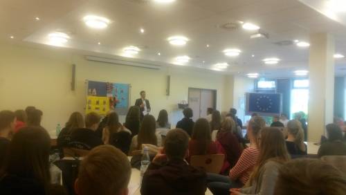 Im Jahr 1950 formulierte der damalige französische Außenminister Robert Schumann am 9. Mai: „Der Beitrag, den ein organisiertes und lebendiges Europa für die Zivilisation leisten kann, ist unerlässlich für die Aufrechterhaltung friedlicher Beziehungen.“ Dies war so etwas wie die Geburtsstunde der Europäischen Union. Aus diesem Grund wird an diesem Tag jedes Jahr in ganz Europa der Gründung gedacht, so auch an der Europaschule GFS. In einer von der Europa-AG unter der Leitung von Annette Wöstmann organisierten Veranstaltung setzt sich der 10. Jahrgang daher intensiv mit dem Thema Europa auseinander. Dazu werden auch die benachbarten Europaschulen aus Twistringen und Sulingen eingeladen. In diesem Jahr konnte der Landtagsabgeordnete Marcel Scharrelmann in seiner Funktion als Vorsitzender der Gruppe „Europa“ und der interfraktionellen Parlamentariergruppe der Europa-Union, sowie als Mitglied des Ausschusses für Bundes- und Europaangelegenheiten im niedersächsischen Landtag begrüßt werden. Angesichts der kurz bevorstehenden, wichtigen Europawahlen machte Scharrelmann zu Beginn der Veranstaltung die Bedeutung der EU klar. So erklärte er, dass die EU insgesamt etwa 512 Mio. Einwohner und damit sogar weit mehr als die USA hätte. Gleichzeitig machte er deutlich, dass die EU nicht nur Grundlage für unseren Frieden ist, sondern auch direkte Einflüsse auf unser Alltagsleben hat, wie z. B. die Freizügigkeit innerhalb Europas. Danach gab es für die Schüler der GFS und einer kleinen Delegation aus Twistringen die Möglichkeit, Fragen zu vier von der Europa-AG vorbereiteten Themenschwerpunkten zu stellen. Dazu gehörte der Brexit, die Frage, wie mit Staaten umzugehen ist, die sich innerhalb der EU immer weiter von der Demokratie in der Form entfernen, wie wir sie in Deutschland verstehen. Außerdem wurde über Asylpolitik und Korruption gesprochen. Moderiert wurde die Fragerunde von Anis El Gumati. In den Fragen wurde dabei deutlich, dass den Schülern die Stärkung und Erhaltung des Staatenbündnisses EU über wirtschaftliche Interessen hinaus wichtig ist. Text: Johannes Luber, Foto: Annette Wöstmann