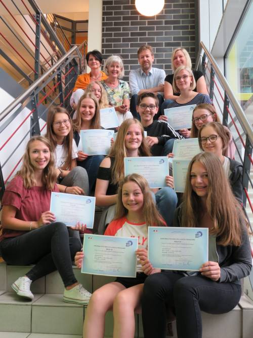 DELF-Prüfungen (Diplôme en Langue Française) werden seit einigen Jahren mit großem Erfolg in Zusammenarbeit zwischen der Graf-Friedrich-Schule und der Volkshochschule angeboten. Ihr Bestehen bedeutet für die Prüflinge eine Zusatzqualifikation im Fach Französisch und ab dem Bestehen des B2-Niveaus, dass für sie die kostspieligen Sprachtests an europäischen Hochschulen entfallen. 14 Schülerinnen und Schüler der Graf-Friedrich-Schule legten ihre DELF-Prüfung im Januar 2018 auf unterschiedlichen Stufen des Europäischen Referenzrahmens ab und ließen ihre Französisch-Kenntnisse überprüfen. Dabei hatten sie Gelegenheit, ihre Kenntnisse im Hörverständnis, in der schriftlichen Textproduktion und in der Fähigkeit, in der Fremdsprache mit „echten“ Franzosen zu kommunizieren, nachzuweisen. Vor den Sommerferien konnten sie jetzt ihre Zertifikate aus dem französischen Erziehungsministerium aus Paris vom Schulleiter der GFS Lars Buse in Empfang nehmen. Vorbereitet wurden die Schülerinnen und Schüler im Rahmen des Fachunterrichts von ihren Französischlehrerinnen Bettina Hemann, Christina Thobe und Annette Wöstmann und dem französischen Sprachassistenten Thimothé Casoni. Auf dem A1-Niveau waren erfolgreich: Lavinia Bartz, Patrick Bernhart, Mareike Götze, Lara Striethorst, Marie-Luise Swiercz und Julia-Marie Titjung. Die Prüfungen auf dem A2-Niveau für Fortgeschrittene bestand Julius Czirjak. Das B1-Niveau konnten Finja Brauneck, Jule Gerdelmann, Fabienne Heidenreich, Xenia Häberle, Thalia Meyer und Michelle Reuter erfolgreich nachweisen. Und auf dem B2- Niveau war Mareike Müller erfolgreich. Herzlichen Glückwunsch! Text: Annette Wöstmann, Foto: Matthias Stock