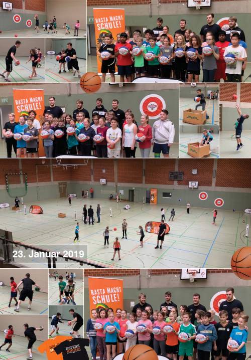 Am Freitag, dem 25.01.19, gab es eine besondere Abwechslung für die jüngsten GFSler in ihrem Stundenplan: Für jeweils 45 Minuten durften sie hautnah mit den Profis von Rasta Vechta trainieren. Eike Kropp, Minitrainer und verantwortlicher Koordinator für die Zusammenarbeit von Rasta Vechta mit den umliegenden Schulen, begrüßte die Schülerschaft und stellte sein Trainerteam vor. In dem sich anschließenden Aufwärmspiel versuchten Habbo (Minitrainer Rasta Vechta) und Hendrik ( U16 Bundesliga-Trainer) den im Feld dribbelnden Schülerinnen und Schülern den Ball abzunehmen. Dabei zeigten die Profis ihr großes Geschick mit dem Ball und ließen einige staunende Schüler - ohne Ball – auf dem Spielfeld zurück. An das Aufwärmspiel schloss sich ein Stationsbetrieb an, in dem die Schülerinnen und Schüler mit viel Spaß und Ansporn durch die Trainer ihr Geschick beim Werfen, Passen, Dribbeln und Spielen beweisen konnten. Der gesamte Jahrgang 5 zeigte sich von seiner besten sportlichen Seite; aus zwei Klassen wurden Schüler direkt zu einem Probetraining eingeladen. Im zweiten Halbjahr startet, gemeinsam mit der Realschule Diepholz und Rasta Vechta, eine Talent-AG Basketball, in der interessierte und talentierte Schülerinnen und Schüler des Jahrgangs 5 im Basketball gefördert werden können. Text und Fotos: Sylke Teuteberg (Fotocollage: Maria Schmutte)