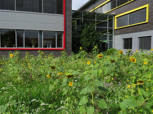 Die Blumenpracht, die im letzten Jahr erstmals auf drei großen Blühstreifen die GFS umgab, hat vielen Insekten Nahrung und den Mitgliedern der Schulgemeinschaft große Freude gebracht. Der Diepholzer Lions Clubs war von der Idee so angetan, dass er den Erlös aus seinem ersten Kickerturnier für dieses schöne Projekt spendete.