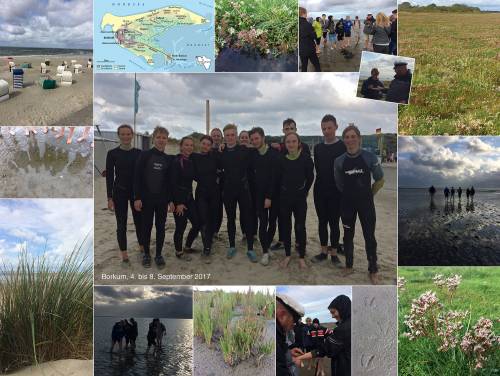 Vom 4.9.-8.9.17 fand die Kursfahrt Wassersport auf Borkum statt. Insgesamt machten sich 13 SchülerInnen mit Frau Scharf und Frau Teuteberg auf den Weg, um zu surfen und ganz nebenbei die Insel Borkum zu erkunden.Der Borkumer Surfspot gehört zu den schönsten Surfspots an der Nordsee - jedoch konnten wir aufgrund des starken Windes nur an zwei Tagen surfen. Diese zwei Tage haben die GFS-SchülerInnen - trotz des immer noch starken Windes - aber mit Bravour gemeistert. Die Surflehrerinnen zeigten sich beeindruckt von der Ausdauer und dem Lernfortschritt der GFS-ler. Weiterer Höhepunkt war eine vom Borkumer Urgestein Bertus geführte Wattwanderung am vorletzten Tag unserer Fahrt. Bertus zeigte uns den typisch nordischen Gruß und das Watt aus vielfältigen Perspektiven, so dass auch die Biologie eN Kursler auf ihre Kosten kamen. Die mitgebrachten Gummistiefel waren gar nicht nötig - Bertus ließ uns erst wieder an Land waten, als das Wasser bereits Kniehöhe erreicht hatte. Immer wieder gab er gruselige Geschichten aus dem Watt zum Besten und sorgte dafür, dass so mancher Schüler im Watt spontan um einen halben Meter kleiner wurde. Auch den Schmerz, den ein Raubwurm aus dem Watt bei seinen Opfern verursacht, wurde sogleich an einer Schülerin getestet. Zum Abschluss durfte ein Auserwählter des Kurses noch am heimischen Gras kauen, bevor dieser über dessen halluzinogene Wirkung aufgeklärt wurde - natürlich trat diese nur bei Konsum größerer Mengen auf. Und das war ja auch gut so, hatten die Kursteilnehmer doch gerade erst gelernt, wie man in einer größeren Gruppe Fahrrad fährt. Abends bereiteten die SchülerInnen Spiele vor; so spielten wir Tabu, fuhren Kartbahn, kegelten und sorgten so für einen gemeinschaftlich-schönen Abschluss, der bleibende Erinnerungen schuf und so die gelungene Kursfahrt mit hohem sportlichem Fahrrad- und Surfeinsatz dennoch gemütlich ausklingen ließ. Text und Fotos: Sylke Teuteberg