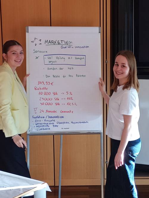 Den Spannungshöhepunkt der MIG-Woche stellte sicherlich der Marketingabend am Donnerstag (9.1.) dar. Die drei Spielgruppen bekamen vom Spielleiter Steffen Vogt (Bildungswerk der Niedersächsischen Bildung gGmbH) die Ausschreibung der virtuellen Einkaufsgemeinschaft „sleep well“ GmbH für Wohnaccessoires für die Lieferung von 100.000 Matratzen. Die Schüler(innen) versahen ihre bislang namenlosen Unternehmen nun endlich mit Namen (rest well, Sanacura, somnia), dachten sich ein imaginäres Produkt aus, entwickelten einen Marketingplan und stellten beides am Donnerstagabend geladenen Gästen aus der lokalen Wirtschaft vor.