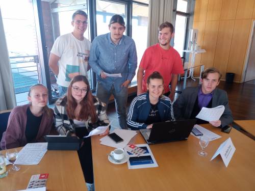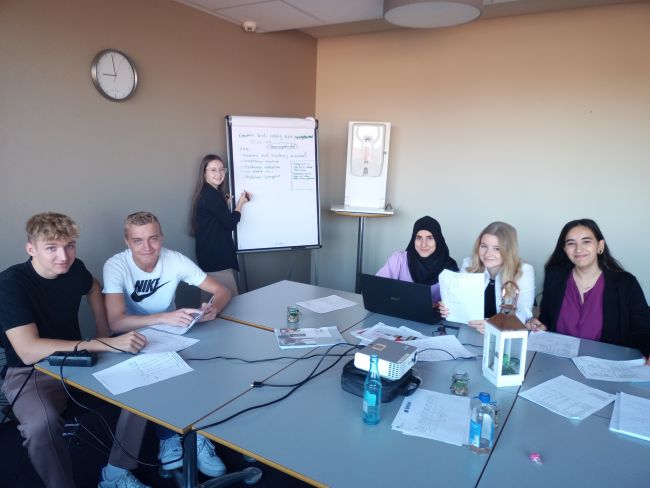 Der Höhepunkt der Woche war aber sicherlich der Marketingabend am Donnerstag (1.9.). Die drei Spielgruppen bekamen vom Spielleiter Steffen Vogt (Bildungswerk der Niedersächsischen Bildung gGmbH) die Ausschreibung einer virtuellen Einkaufsgemeinschaft für KFZ-Teile für die Lieferung von 300.000 Autositzen. Die Schüler(innen) dachten sich ein imaginäres Produkt aus, entwickelten einen Marketingplan und stellten beides am Donnerstagabend geladenen Gästen aus der lokalen Wirtschaft vor.