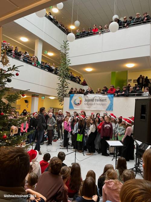 Am letzten Schultag vor den Weihnachtsferien wurde es weihnachtlich im Lichthof der Graf-Friedrich-Schule. Die gesamte Schule hatte sich versammelt, um vor dem festlich geschmückten Weihnachtsbaum auch musikalisch das Fest einzuläuten.