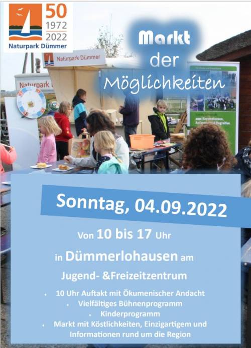 Seit diesem Jahr gibt es den Naturpark Dümmer schon 50 Jahre. Um dies gebührend zu feiern findet am 04.09.2022 am Jugend- und Freizeitzentrum in Dümmerlohausen ein Markt der Möglichkeiten statt. Über 30 Aussteller bieten hier Kunsthandwerk, Experimentelle Archäologie von Archäotechnikern, Leckereien und Kinderaktionen an – ein Erlebnis für die ganze Familie.