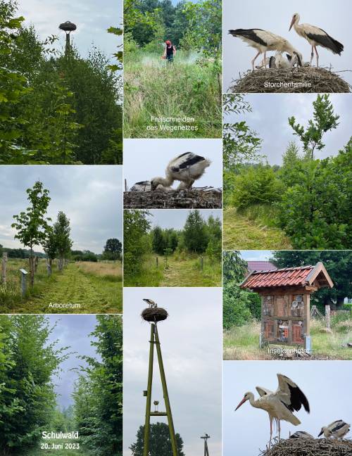 Aufmerksam beobachtet wurden die Arbeiten aus der Höhe von den beiden Storchenküken, die schon ordentlich gewachsen sind. Gegen 10 Uhr kamen die Elterntiere zurück und fütterten die Kleinen.
