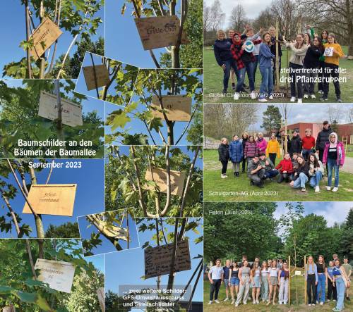 Die Bäume sind allesamt angewachsen und haben sich bereits kräftig entwickelt. Kurz vor den großen Jubiläumsfeierlichkeiten anlässlich von „100 Jahre GFS“ Ende August fanden Holztafeln ihren Platz. Auf ihnen stehen jeweils die Bezeichnung der Gruppe - besten Dank für’s Lasern, Herr Reimer! - sowie die Unterschriften ihrer Mitglieder. Auch wurden Gruppenbilder „in voller Besetzung“ gemacht; auf der nebenstehenden Collage sind stellvertretend drei dieser Gruppenbilder zu sehen. Sie geben einen kleinen Eindruck davon, wie viele Schüler sich an der GFS ehrenamtlich engagieren. Auch an dieser Stelle sei ihnen und den betreuenden Lehrern für ihren wertvollen Einsatz gedankt.