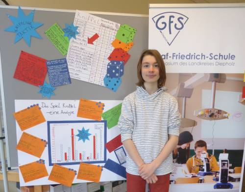 Der Schülerwettbewerb “Jugend forscht” ist in den letzten Jahren immer beliebter geworden, von Jahr zu Jahr zu Jahr nehmen mehr Jungforscher in den Kategorien "Schüler experimentieren" (4. Klasse bis 14 Jahre) und "Jugend forscht" (15 bis 21 Jahre) teil. Daher musste nun ein neuer Regionalwettbewerb eingerichtet werden, um die wachsende Zahl eingereichter Projekte bewältigen zu können. Aufgrund der günstigen Lage fiel die Wahl der Stiftung Jugend forscht e.V. auf Diepholz, wobei als passender Ort für den Wettbewerb die BBZ ausgewählt wurde, da dort gute räumliche Rahmenbedingungen vorliegen. Die GFS war als Kooperationspartner im Wesentlichen für das leibliche Wohl der Jungforscher beteiligt. Nach einer intensiven Planung und Vorbereitung der beiden Schulen in Kooperation mit dem Bildungsbüro des Landkreises Diepholz war es am 22./23. Februar dann endlich soweit. Über 100 Jungforscher stellten ihre Projekte in 6 Fachgebieten den fachkundigen Juroren vor. Die Verpflegung der Teilnehmer übernahmen Schülerinnen und Schüler der Jahrgänge 11 und 12. Sie wurden dabei von der Klasse 7b unterstützt, die ebenfalls den Ordnerdienst für die beiden Wettbewerbstage übernahm. Mittag- und Abendessen übernahm der Caterer apetito. Zudem war die GFS auch an der Gestaltung des Rahmenprogramms beteiligt. Lehrkräfte der GFS boten Workshops für die Jungforscher an, in der sie ihre Kreativität und ihren Forschergeist unter Beweis stellen konnten. Die feierliche Preisverleihung fand im Theater der Stadt Diepholz statt. Landrat Cord Bockhop betonte in seinen Grußworten die Bedeutung des Landkreises Diepholz als Wissenschaftsstandort. Die musikalische Begleitung der Veranstaltung übernahmen der Chor und das Orchester der GFS. Insgesamt gab es bereits während des Wettbewerbs viel positives Feedback für die Organisatoren. Gekrönt wurde der erfolgreiche Einstand des Wettbewerbsstandortes Diepholz durch den Regionalsieg des GFS-Schülers Johannes Luber (Klasse 9c) im Fachgebiet Mathematik mit seinen Untersuchungen zu Gewinnstrategien beim Würfelspiel "Kniffel". Johannes vertritt die Region beim Landeswettbewerb „Schüler experimentieren“ vom 5.4.-7.4.2018 in Oldenburg. Wer Johannes dort vor Ort die Daumen drücken möchte, dem sei gesagt, dass der Besuch der Wettbewerbsausstellung für die Öffentlichkeit am 6.4. ab 09 Uhr möglich ist. Die Ausstellung findet im Zentrum für Aus- und Weiterbildung der EWE AG (Waterender Weg 30a, 26123 Oldenburg) statt. Text: Dr. Timo Feierabend, Foto: Lars Buse