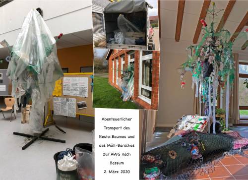 Mit vereinten Kräften haben wir - Sabine Buse, Wilhelm Paradiek und Maria Schmutte - den Reste-Baum der Schulgarten-AG aus dem Lichthof samt Müll-Barsch von Theresa Wiedemann (11) zur AbfallWirtschaftsGesellschaft nach Bassum transportiert.