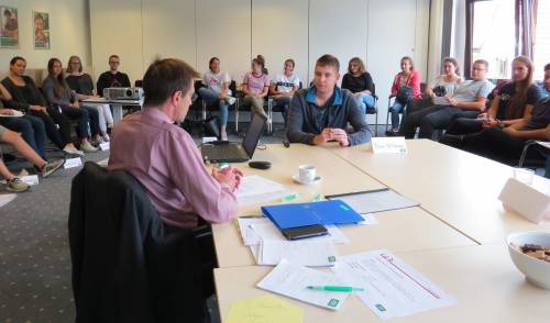 In der vergangenen Woche durchliefen 25 Schülerinnen und Schüler des 12. Jahrgangs der Graf-Friedrich-Schule in Diepholz ihr dreitägiges Projekt in der AOK Diepholz. Ziel war es, die künftigen Abiturienten auf ihre Bewerbungen für die spätere Arbeitswelt vorzubereiten, aber auch ihnen zu zeigen, wie sie beispielsweise das Assessment-Center (kurz AC) erfolgreich abschließen. Das Assessment – Center ist eine Methode zur Einschätzung von Personen in den Bereichen der Personalauswahl. Dabei lernten sie nicht nur ihre eigenen Stärken und Schwächen zu analysieren, sondern auch, wie ein schriftlicher Einstellungstest abläuft, indem sie unter realen Bedingungen solch einen Test durchführten. Zudem wurden ihnen einige Tipps und Infos genannt, um die späteren Vorstellungsgespräche zu meistern. Es folgten praktische Übungen, bei denen die Schüler und Schülerinnen in kleineren Gruppen Verkaufsgespräche, Gruppenübungen, aber auch Rollenspiele eines Vorstellungsgespräches planten und anschließend vorstellten. Diese kleineren Projekte wurden genau beobachtet und im Anschluss ehrlich beurteilt. Den Schülerinnen und Schülern wurden im Laufe der Tage nicht nur wichtige Informationen für die spätere Bewerbung beigebracht, sondern sie erfuhren bedeutende Dinge über die Aufgaben und Leistungen der Sozialversicherung, Unterschiede zwischen der gesetzlichen und privaten Krankenversicherung und Beispiele zur Lohn- und Gehaltsabrechnung. Die Atmosphäre und der Umgang zwischen den Teilnehmern und den Mitarbeitern waren vom ersten Tag an durchweg positiv. Die Schülerinnen und Schüler bedankten sich besonders bei folgenden AOK- Referenten: R. Hollweg, K. Kobbenbring und F. Tecklenborg, die das Bewerbungstraining an den drei Tagen mit viel Abwechslung, Energie und Begeisterung leiteten. Text: Viktoria Ernst, Foto: Nele Schwieger