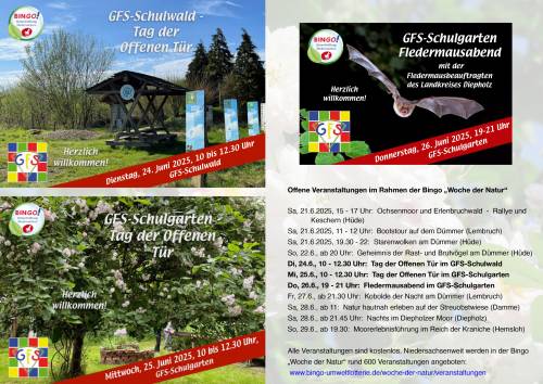 Im Rahmen der Bingo "Woche der Natur" (21.6. - 1.7.25) werden auch an der GFS mehrere Veranstaltungen angeboten, davon drei für die Öffentlichkeit.