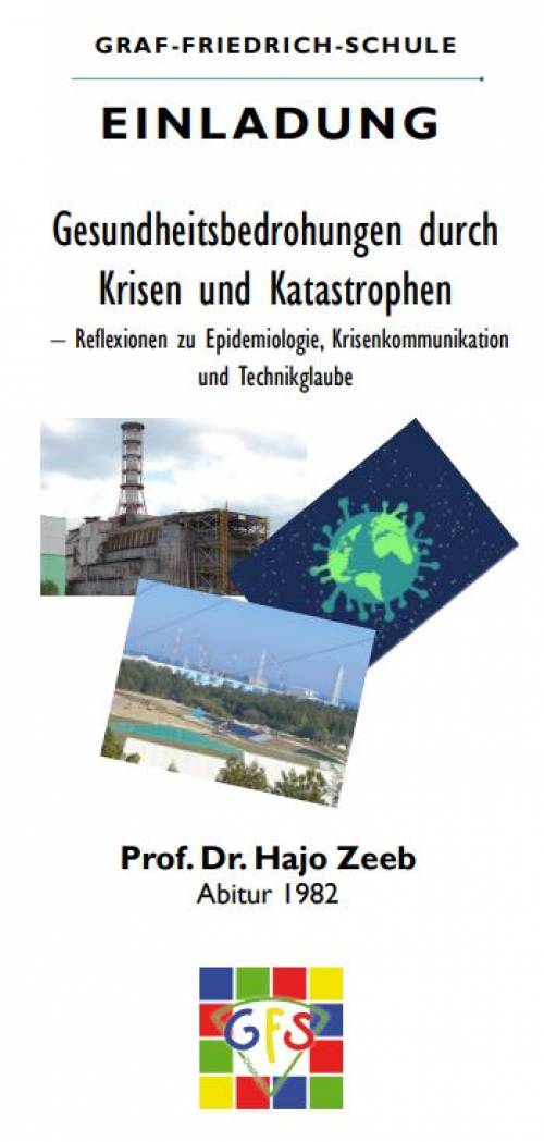 Am 8. Februar hält der ehemalige GFS-Schüler Prof. Dr. Hajo Zeeb (Abitur 1982) im Rahmen der Veranstaltungsreihe "Von der Schule in die Welt" einen Vortrag mit dem Titel "Gesundheitsbedrohungen durch Krisen und Katastrophen – Reflexionen zu Epidemiologie, Krisenkommunikation und Technikglaube" in der Mensa der Graf-Friedrich-Schule.