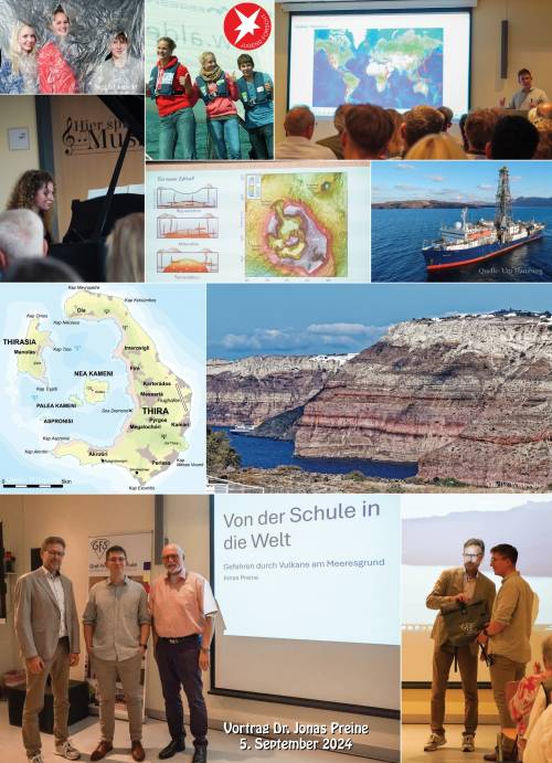Forschungsobjekt seiner Doktorarbeit war der Vulkan Santorini/Griechenland, worüber Jonas Preine im zweiten Teil seines Vortrages berichtete. Santorini zählt zu den am besten erforschten Vulkanen der Welt, aber vor 2024 war er nie mit einem Bohrschiff untersucht worden. Ziel war es, einen nur aus einer literarischen Quelle bekannten Ausbruch aus dem Jahr 726 n. Chr. zu verifizieren. Das Meer habe damals gekocht und eine solche Menge an Bimsstein sei ausgeworfen worden, dass riesige Flächen bedeckt gewesen und an alle Küsten der Ägäis bis hin nach Konstantinopel geschwemmt worden seien. Der Ausbruch habe eventuell zu der schweren sozioökonomischen Instabilität, die die folgenden Jahre dort erschütterte, geführt.