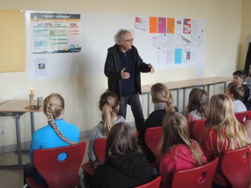 … kamen sich wieder einmal unsere Fünftklässler vor, als Eberhard Vogelwaid einige seiner spannenden Geschichten frei vortrug und wie immer auch selbst in ihnen aufzugehen schien. Der bei den Kleinen außerordentlich beliebte Vortragskünstler ist mit seinen Märchen aus aller Welt schon seit mehr als zehn Jahren Stammgast an unserer Schule. Auch dieses Mal wurde der fünfte Jahrgang in zwei Zuhörergruppen aufgeteilt, um eine persönlichere Atmosphäre zu erzeugen, zumal der Erzähler seine junge Zuhörerschaft auch immer wieder in den Vortrag interaktiv einbezieht. In diesem Jahr hatte er für die eine Gruppe nicht nur ein spannendes Inuit-Märchen mitgebracht, sondern auch den „Eisenhans“ aus den „Kinder- und Hausmärchen“ der Grimm-Brüder, in dessen Handlung er eine der Figuren ein weiteres Märchen erzählen ließ. Als Zugabe gab es eine kurze irische Gespenstergeschichte. Wenige Tage zuvor hatte Eberhard Vogelwaid bereits den siebten Jahrgang mit einem fesselnden Balladenvortrag zu beeindrucken vermocht, auch dies bei uns an der GFS nunmehr bereits zum vierten Mal. Dabei gelang es ihm nicht nur, einigen (den jungen Zuhörern aus dem Unterricht bekannten) deutschen Balladen-„Klassikern“ von Goethe oder Fontane ganz neue Facetten abzugewinnen, sondern er zelebrierte auch weniger bekannte Werke auf seine unnachahmliche Art und Weise, darunter Adelbert von Chamissos „Der rechte Barbier“ oder sogar eine von ihm selbst zur Ballade umgeschriebene Erzählung aus „Tausendundeine Nacht“. Wie immer fielen bei den Vorträgen auch einige beachtenswerte Lebensweisheiten ab, die der Ottersberger Vortragskünstler geschickt zu akzentuieren versteht. Im Mai wird Eberhard Vogelwaid in unserem zehnten Jahrgang noch einmal mit ausgewählter Lyrik zu Gast sein. Text und Foto: Dr. Hartmut Büscher