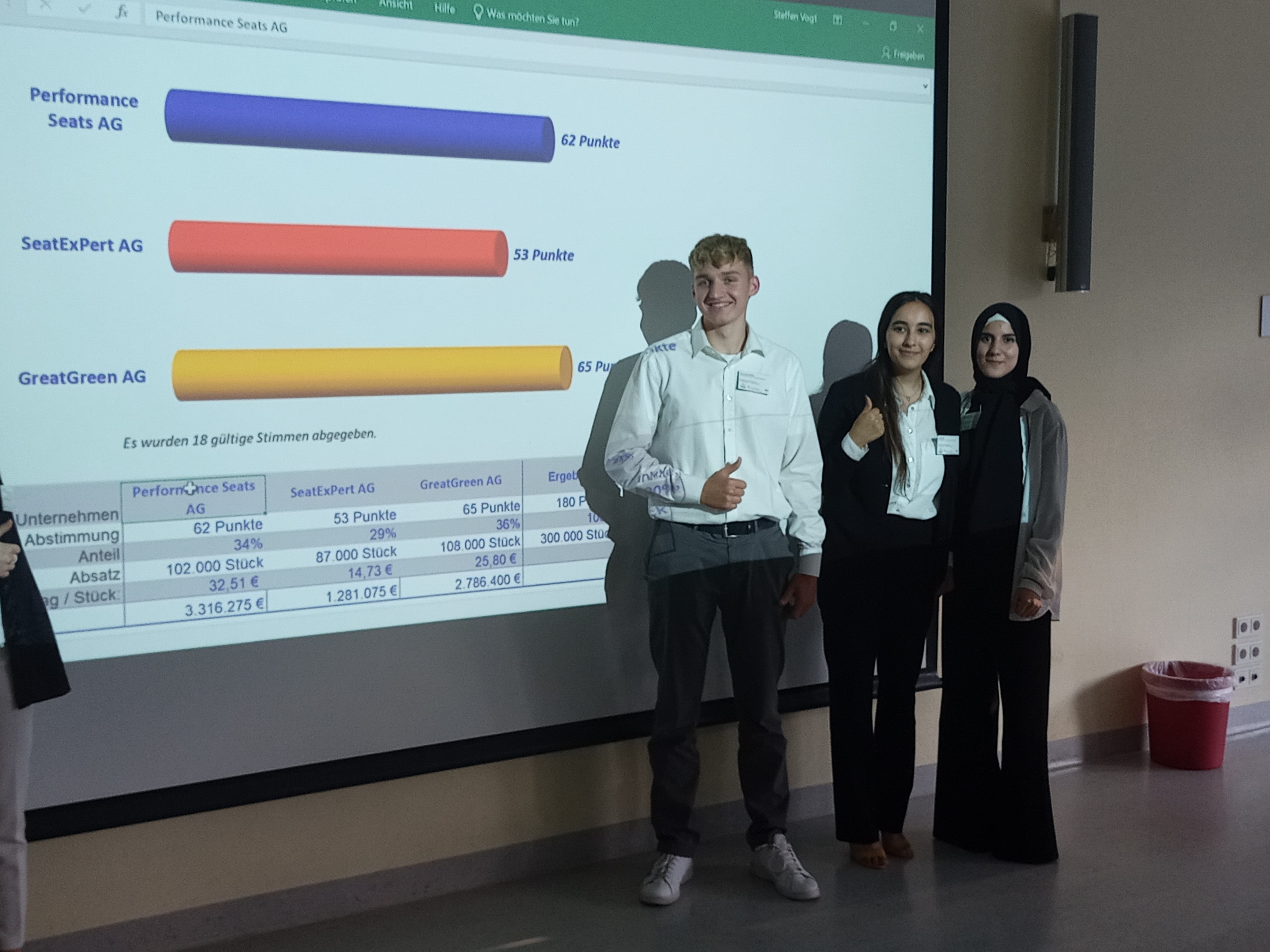 Der Höhepunkt der Woche war aber sicherlich der Marketingabend am Donnerstag (1.9.). Die drei Spielgruppen bekamen vom Spielleiter Steffen Vogt (Bildungswerk der Niedersächsischen Bildung gGmbH) die Ausschreibung einer virtuellen Einkaufsgemeinschaft für KFZ-Teile für die Lieferung von 300.000 Autositzen. Die Schüler(innen) dachten sich ein imaginäres Produkt aus, entwickelten einen Marketingplan und stellten beides am Donnerstagabend geladenen Gästen aus der lokalen Wirtschaft vor.